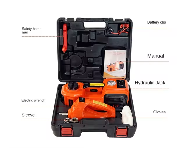 رافعة سيارة كهربائية + مفتاح ربط صدمي كهربائي + مطرقة أمان + صندوق أدوات سيارة بلاستيك + كيبل توصيل مشبك بطارية + قفازات + كيبل طاقة + محولات مقبس + صمام كهربائي + تعليمات